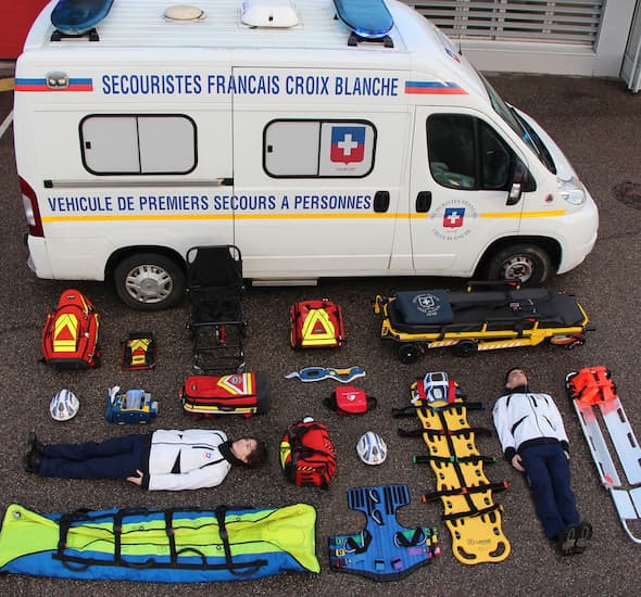 Matériel adapté : ambulances, véhicules tout-terrain, tentes de secours, groupes électrogènes, moyens de télécommunication, matériel de sauvetage, etc.